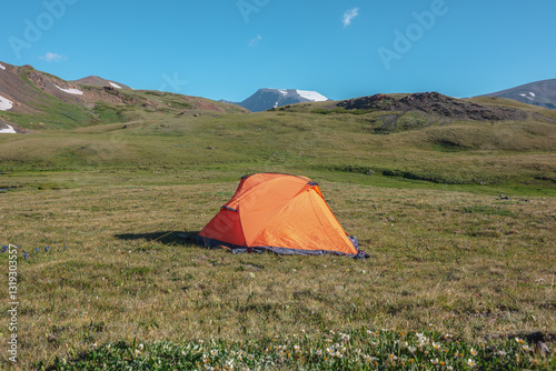Sunlit orange tent on alpine grassy glade near white flowers of dryas among green rocky hills against snow mountain top under blue sky in sunny day. Tent on green grass in bright sun in high mountains