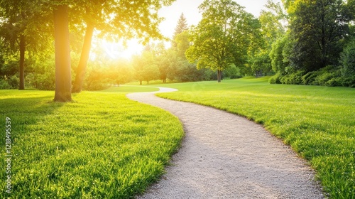 Sunlit park path winding through green grass, trees; sunrise background