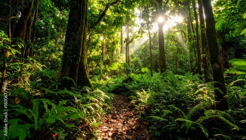 Sunlit Path in Lush Forest: A serene path winds through a vibrant, sun-dappled forest, evoking a sense of exploration and the beauty of nature. Capturing the interplay of light and shadow.