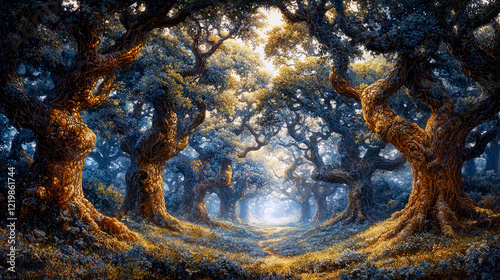 Sunlit Path Through a Mystical Forest: An Enchanting Nature Scene of Ancient Trees and Golden Light