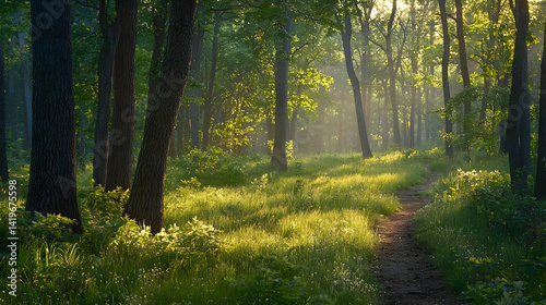 forest, tree, path, sunlight, nature, wood, green, yellow, morning, sunbeam, grass, leaf, daylight, light, sunshine, morning light, landscape, meadow, plant, green tree, oak tree, sun ray, golden light, tranquil, peaceful, serene, beauty, scenic, natural, environment, hiking, walking, adventure, travel