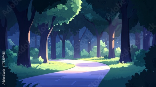 forest, path, tree, sunlight, leaf, green, shadow, wood, nature, mystical, magical, serene, tranquil, peaceful, calm, quiet, dark, light, dappled, shade, summer, spring, autumn, pathway, trail, road, lane, walk, journey, adventure, exploration, mystery, secret, hidden, deep, dense, lush, vibrant, colourful, illustration, digital, art, painting, artwork, scenery, landscape
