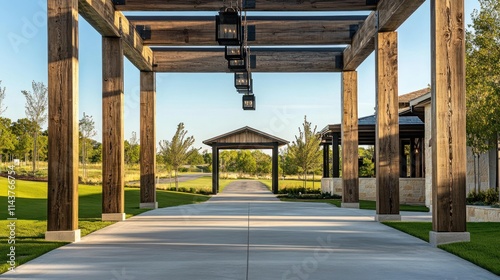 pathway, pergola, lantern, wood, sunlit, entrance, paseo, architecture, design, landscape, garden, summer, daylight, shadow, tree, building, structure, gate, driveway, concrete, beam, pillar, rustic, elegant, luxury, resort, hotel, estate, country, club, park, avenue, path, walk, stroll, light, illumination, ambience, serenity, tranquil, peaceful