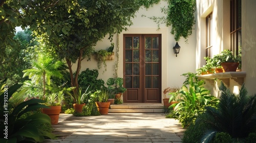 garden, patio, house, plant, door, sun, summer, light, green, tree, leaf, pot, terracotta, stone, paseo, entrance, exterior, home, architecture, design, landscaping, nature, decor, style, tropical, mediterranean, villa, building, wall, peaceful, tranquil, serene, relaxed, bright, shadow, path, view, scene, background