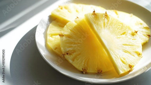 Sunlit plate of pineapple slices arranged in wedges. Concept Pineapple Slices, Sunlit Produce, Wedge Arrangement, Bright Food Photography, Fresh Summer Fruit