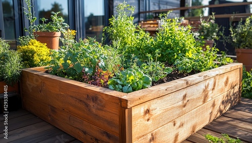 Sunlit Raised Garden Bed with Lush Green Vegetables and Herbs