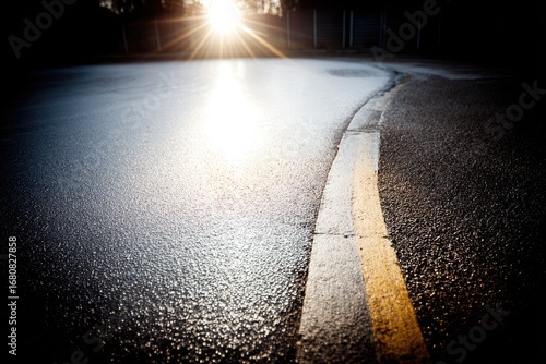 Sunlit Road with Yellow Lane Marking