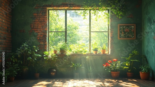 Sunlit room, plants, window, brick wall, peaceful.