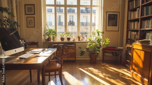room, sunlit, desk, chair, bookcase, bookshelf, plant, pot, window, light, wooden, floor, book, shelf, wall, sunlight, shadow, frame, artwork, computer, keyboard, interior, home, apartment, paris, french, vintage, elegant, cosy, warm, natural, gold, bright, soft, airy