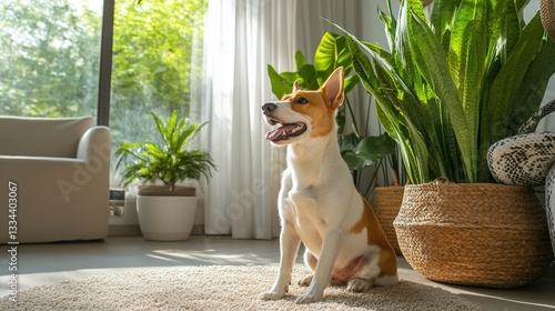 Sunlit serenity: A sweet dog relaxes on a cozy rug, bathed in warm light with a stylish, plant-filled living space visible beyond