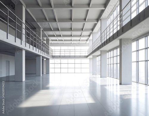 Sunlit, spacious, empty interior with high ceilings, multiple levels, and large windows
