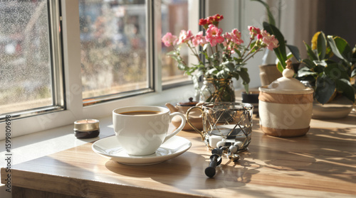 Sunlit windowsill scene featuring a white coffee cup, saucer, teapot, floral arrangement, candle, and other decorative items on a light wood surface