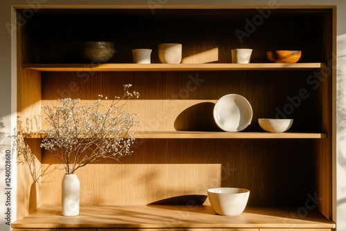 shelf, wooden, pottery, bowl, cup, plate, dried, flower, vase, sunlight, shadow, minimalist, home, decor, interior, design, oak, wood, grain, texture, light, warm, neutral, beige, off-white, brown, tan, earthenware, stoneware, ceramic, rustic, simple, elegant, aesthetic, ambience, tranquil, serene, calm, space, display, arrangement, style, contemporary