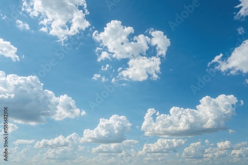 Sunny day blue sky panorama, white fluffy clouds, atmospheric purity, clear background for design.