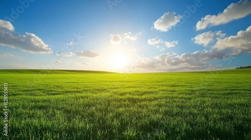 field, green, grass, landscape, nature, sky, sun, cloud, horizon, summer, day, bright, scenic, beautiful, view, scenery, rural, agriculture, farm, meadow, pasture, countryside, ecology, environment, planet, earth, sunshine, sunlight, light, spring, growth, freshness, serenity, peace, calm, tranquil, immensity, expanse, open, space, beauty, amazing, marvellously, stunning