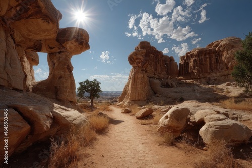 desert, path, sandstone, rock, sunlight, landscape, dry, sunny, mountain, vale, formation, trail, nature, scenery, outdoors, panorama, travel, hiking, exploration, adventure, journey, arid, brown, orange, tan, clay, vegetation, tree, small, lonely, empty, huge, open, sky, cloud, geologic, earth, stone, rugged, wild, ancient, impressive, dramatic, splendid, exterior, view, beauty