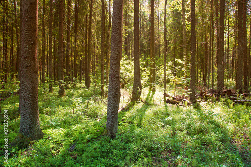 Sunny forest landscape . Spruce forest.