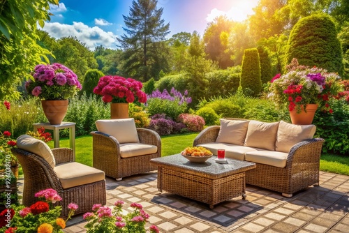 Sunny garden patio with wicker outdoor furniture, lush greenery, and vibrant flowers, featuring a clean, empty space for text or product showcase.