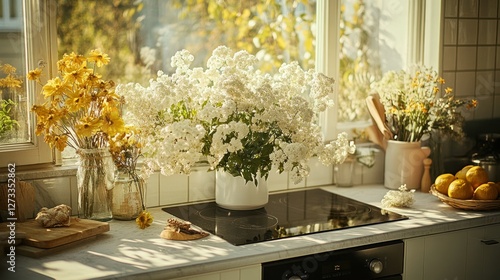 kitchen, flower, countertop, window, sunlight, home, decor, arrangement, cosy, spring, yellow, white, still life, bouquet, vase, morning, autumn, fresh, natural, rustic, elegant, interior, home decor, floral, display, pretty, bright, happy, warm, sunlit, beautiful, calm, simple, vintage, modern, nature, living, interior design, homelike, decorating, springtime, freshness, yellow flower, white flower, view, fresh flower
