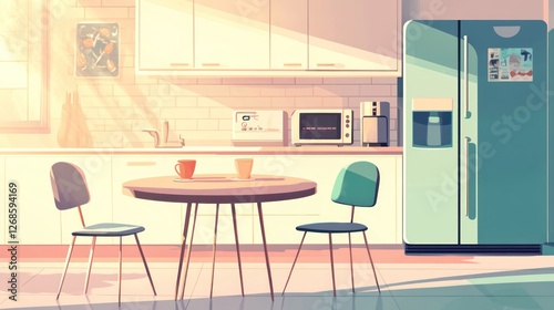 kitchen, interior, sunny, light, empty, table, chair, modern, refrigerator, microwave, hot drink, dining, room, home, decor, morning, sunlight, breakfast, tableware, food, illustration, design, vector, space, cosy, clean, apartment, living, concept, beautiful, cute, simple, stylish, warm, bright, minimalist, roomy