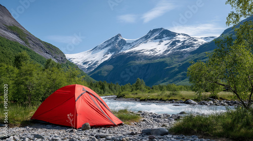 Sunny river camping in Norwegian mountains setting, outdoor recreational environment, Scandinavian wilderness camping, mountain riverside experience, with copy space