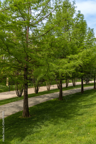 Sunny spring morning 2024. Bald Cypress Taxodium Distichum (swamp, white-cypress, gulf or tidewater red cypress) tree in public landscape city Park Krasnodar or Galitsky park.