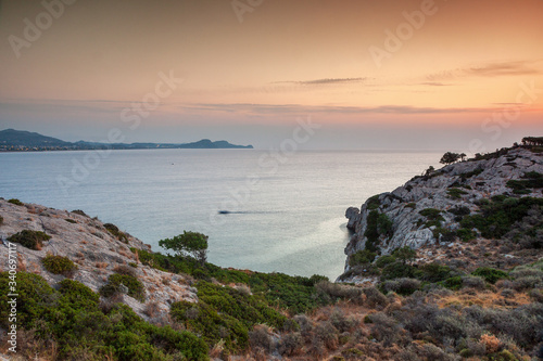 Sunrise at bay near city Kolympia, Rhodes, Greece
