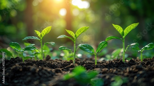 Sunrise Growth: Young Plants Emerging in a Lush Forest