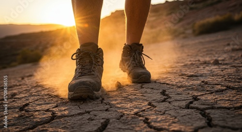hiking, boot, trail, sunrise, dust, adventure, nature, foot, landscape, exploration, travel, person, sunlight, earth, activity, journey, walking, motion, rugged, terrain, photograph, scenery, wild, mountain, solitude, environment, health, fitness, energy, summer, dirt, scenic, path, freedom, life events, exercise, wanderlust, natural beauty, calmness, escape, trek, vibrant