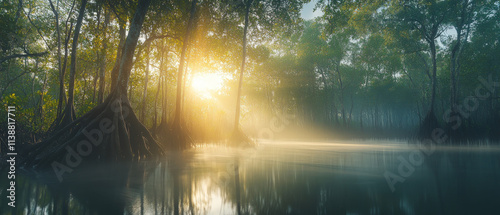 mangrove, forest, sunrise, wetland, landscape, photo, nature, serene, calm, background, golden hour, long exposure, water reflection, tree, root, mist, fog, peaceful, tranquil, tropical, environment, artistic, scenic, beautiful, vibrant, golden light, sun ray, natural beauty, water, green, yellow, orange, blue, brown, dark, light, contrast, texture, silhouette, stillness, harmony, balance, travel, adventure, exploration, conservation, preservation