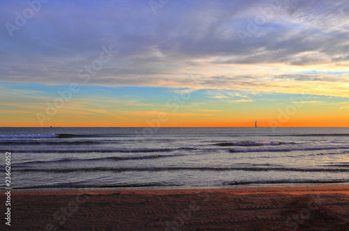 Sunrise on the beach. A sailing yacht in the open waters of the Mediterranean Sea. Maritime landscape with the vivid colors of daybreak at Malvarrosa Beach, Valencia, Spain.