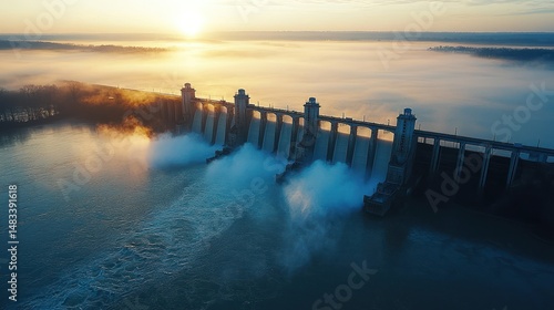 sunrise, dam, river, mist, fog, water, power, energy, hydroelectric, morning, nature, landscape, aerial, view, architecture, industrial, structure, concrete, waterway, flowing, turbine, hydraulic, technology, environment, conservation, control, regulation, navigation, scenic, gold, light, motion, powerful, calm, still, vapour, huge, horizon, big, wide, environmentally, responsible, construction, infrastructure, exterior