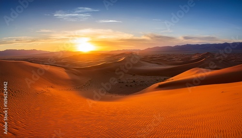 sunrise over a desert landscape of orange sand dunes