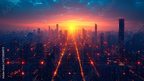 city landscape, sunrise, city, skyline, futuristic, aerial, view, urban, technology, architecture, modern, building, dawn, light, night, glow, vibrant, light, illuminated, street, networking, connection, abstract, digital, line, energy, innovation, network, city landscape, downtown, bright, evening, glowing, metropolis, morning, highrise, urban scene