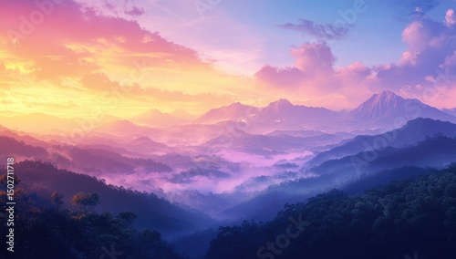 sunrise, sunset, mountain, misty, cloud, colourful, vibrant, fog, vale, forest, jungle, nature, landscape, aerial, view, scenic, beauty, peace, tranquil, dramatic, texture, light, colours, gradient, pastel, orange, pink, purple, blue, green, elevation, horizon, peak, slope, range, high, depth, atmosphere, mountainous, hill, vegetation, tree, exotic, high-coloured, stunning, gorgeous, serene, dreamlike, immaculate