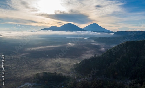 Sunrise over Mount Batur and Mount Agung, volcanoes in Bali, Indonesia. The landscape is filled with mist and clouds in the early morning light.