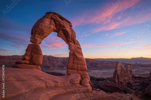 Sunrise over the Mesa Arch in a vast canyon landscape