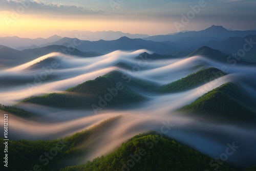 Sunrise over the misty mountains of a national park. The landscape is dotted with lush green hills and rolling clouds.