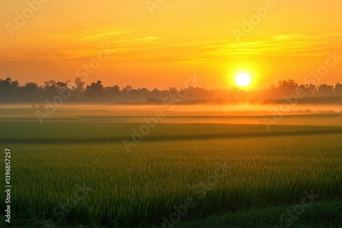 Sunrise paints a golden hue over a misty rice paddy, creating a serene and peaceful landscape.
