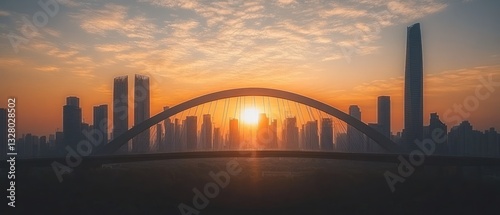 Sunrise Silhouette: Modern Cityscape Framed by an Arch Bridge