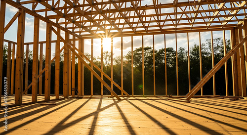Sunrise through bamboo construction structure illuminated by golden light rays
