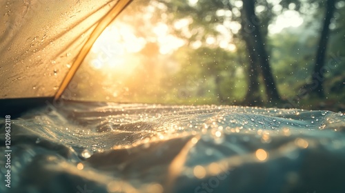 sunrise, tent, forest, nature, camping, outdoors, adventure, travel, morning, sunlight, water, drop, dew, landscape, scenic, background, scene, view, wood, tree, green, light, summer, day, wet, texture, fabric, canvas, shiny, gold, peaceful, calm, relaxing, escape, journey, exploration, wild, rustic, element, environment, atmosphere, dawn, ray, shadow, beam
