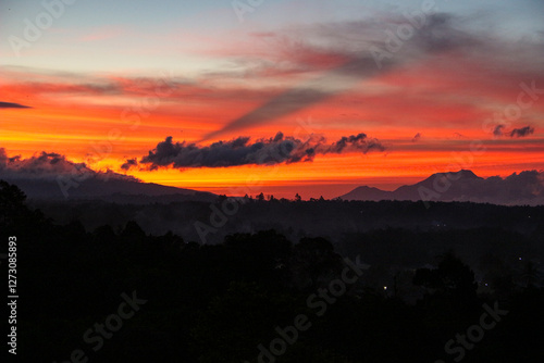 Sunset and black shadows in Bukittinggi with a backdrop of the Bukit Barisan hills of Sumatra and tropical forests in West Sumatra, Indonesia on July 13, 2018