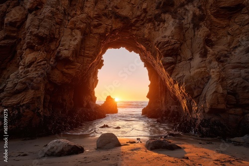 Sunset archway, beach cove, golden hour, ocean view. Possible use travel postcard