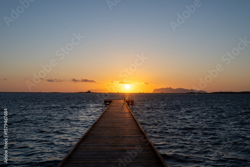 Sunset at Stagnone of Marsala, brackish lagoon and nature reserve near Marsala, Sicily, Italy, unique ecosystem with shallow, warm water, salt pans, and ancient windmills.
