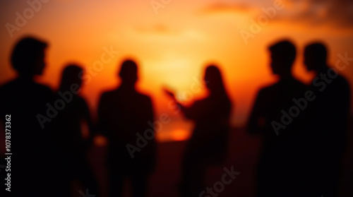 Sunset by the ocean shore with silhouettes of a group of people, friends' meetup, blurred image