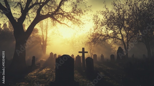 Sunset casts long shadows over a misty graveyard, highlighting silhouetted trees and tombstones in a somber, eerie scene.