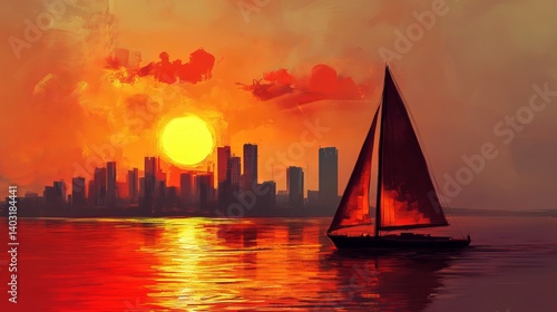 sunset, city landscape, sailboat, painting, orange, sky, water, horizon, building, travel, scenic, art, cloud, sea, boat, maritime, sun, dusk, evening, coast, ocean, sail, city, landscape, gold, artwork, vessel, calm, nature, scene, red, bright, artistic, design, graphic, illustration, background, image, skyline, tour tourism, vacation, seascape, marina, harbor, dawn, warm, beautiful, sailing