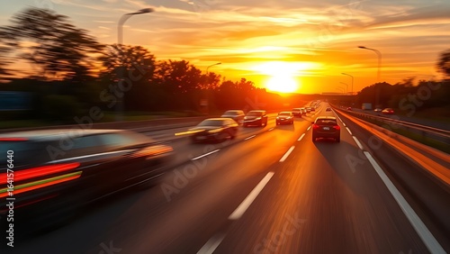 Sunset highway with blurred motion and warm golden light.
