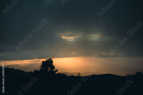 sunset in the mountains orange overcast foggy misty sky